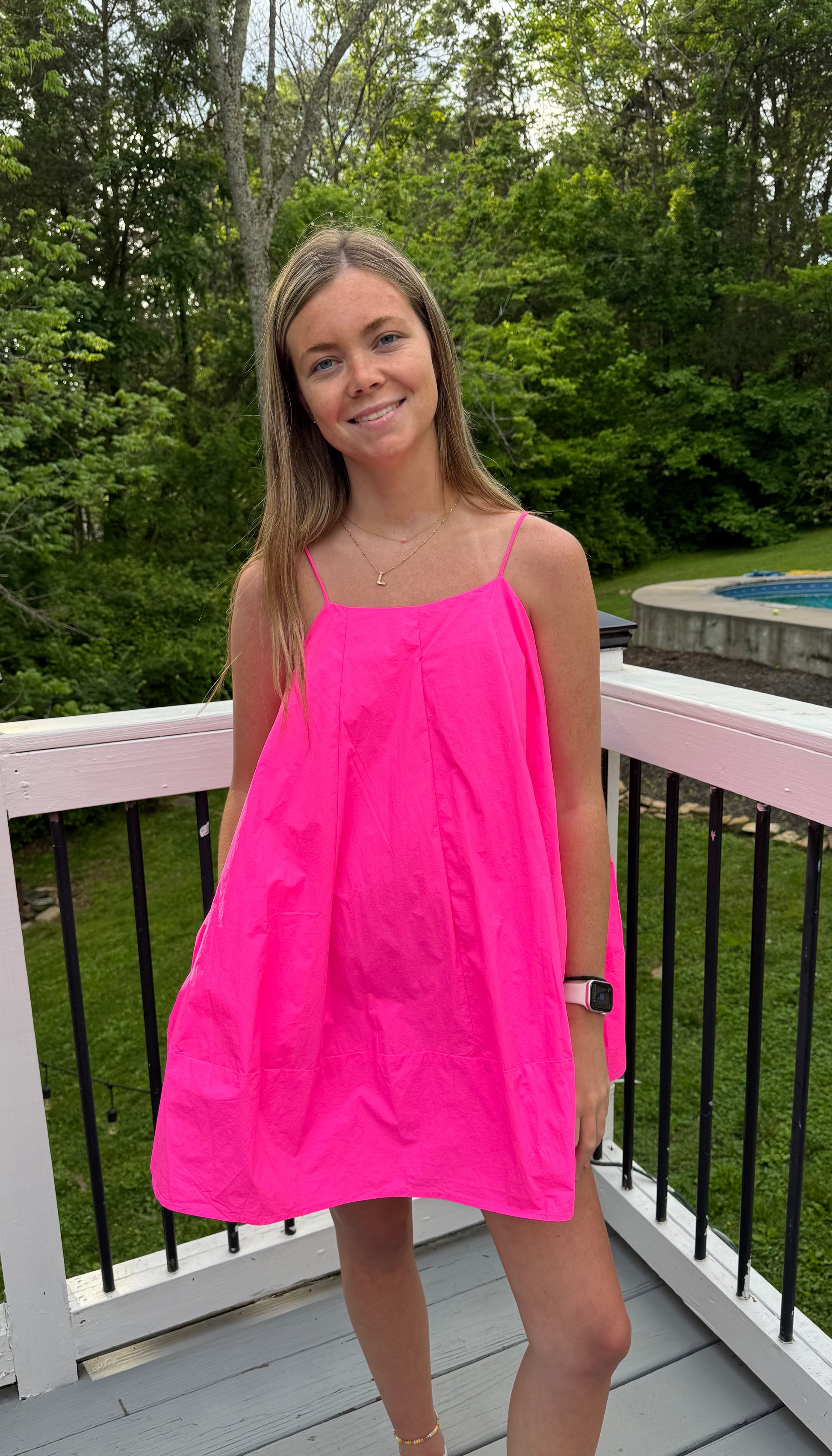 Hot pink, adjustable strap dress with pockets is perfect for hot summer days or nights.