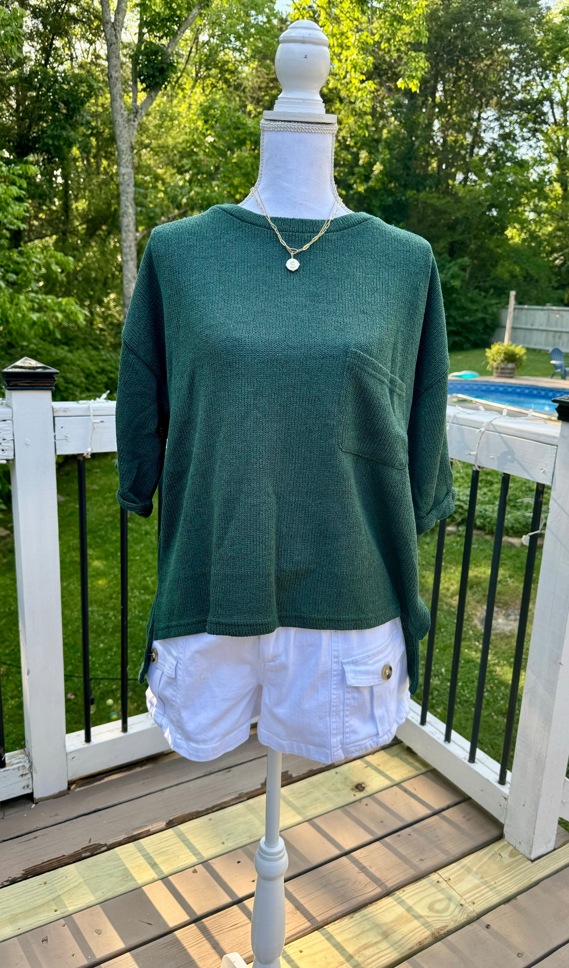 This pretty sea green sweater is a little longer in the back and has a pocket on left front with a 3/4 sleeve