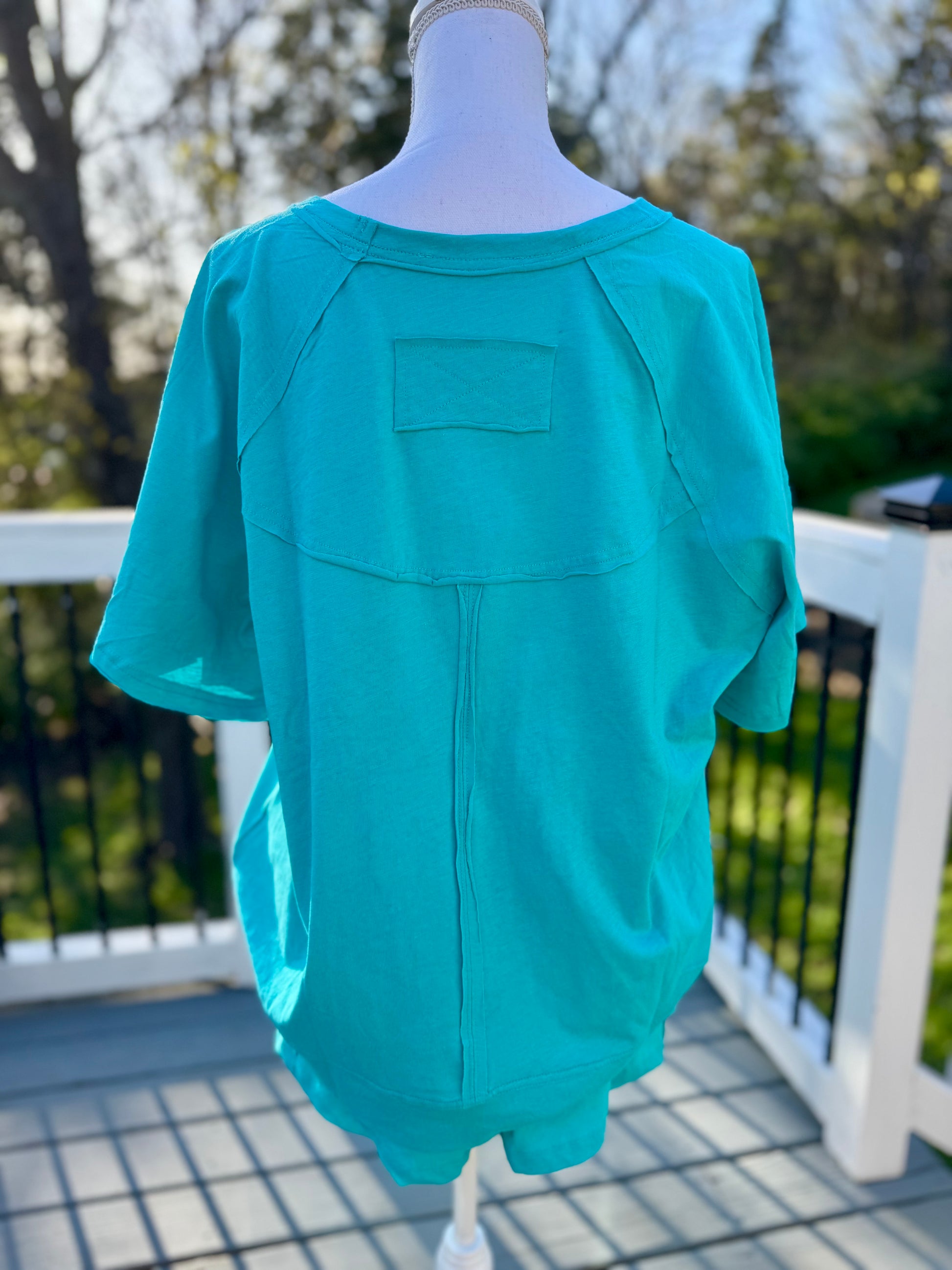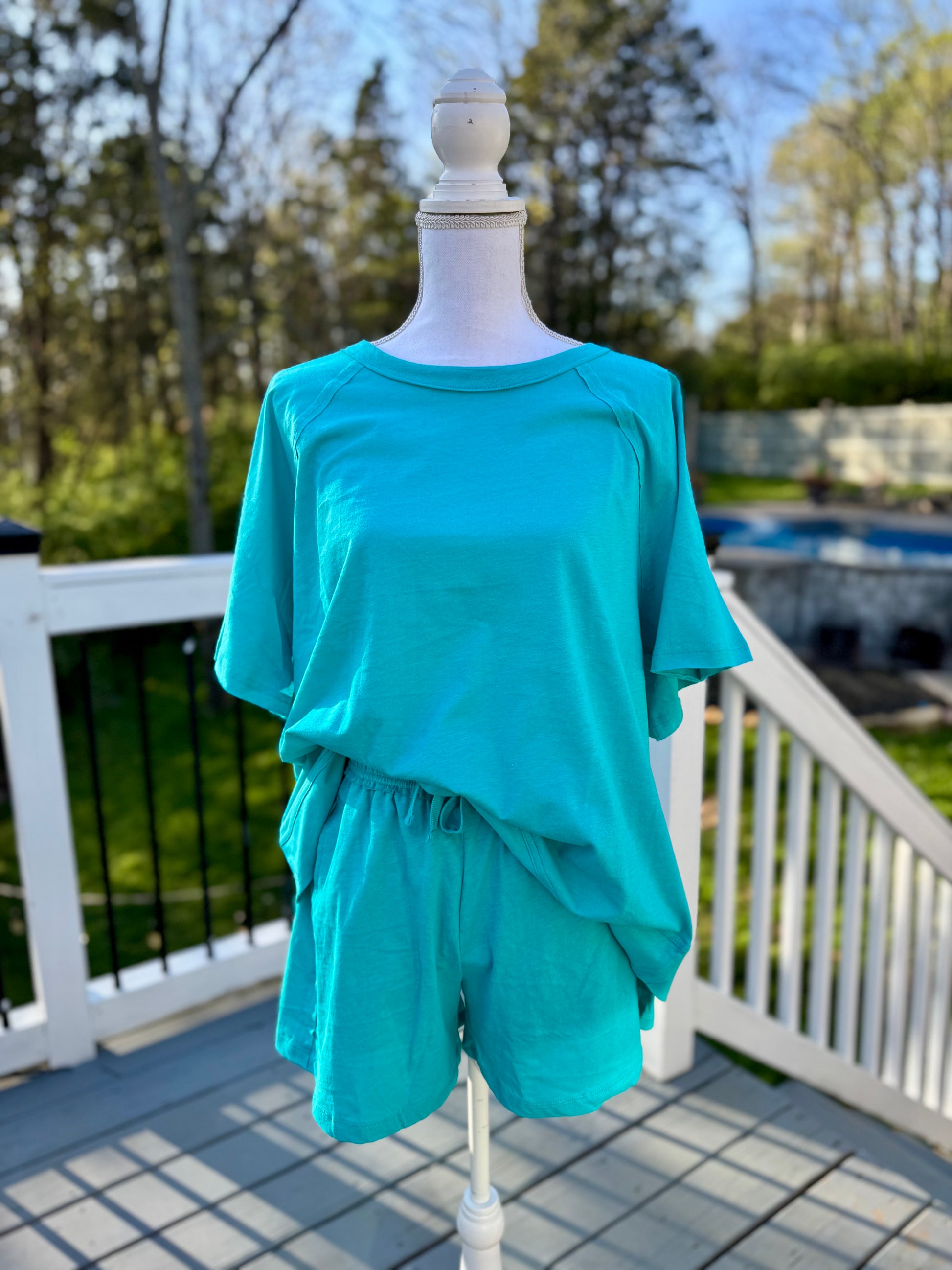 Nothing says comfy more than this set. It is 100% cotton with pockets. The shorts have pockets and drawstring waist.